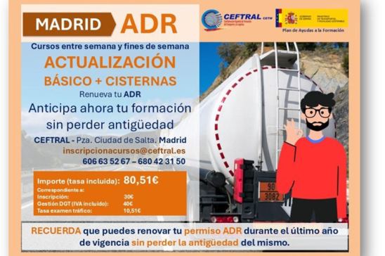 CEFTRAL oferta plazas para un curso de actualizacion ADR (básico + cisternas) para el fin de semana del 18 al 20 de julio.