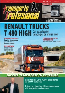 www.transporteprofesional.es Nº 479 Febrero 2026 / 5euros Estabilizado en 30.000 unidades ENTREVISTA CON… Xavier Consuegra, presidente de Asotranslleida PREVISIONES EN EL TRANSPORTE Así será 2026 en el sector EN PORTADA Crisis de los agricultores RENAULT TRUCKS T 480 HIGH MERCADO VI José Manuel Lara, nuevo presidente de CETM Cisternas Entran en vigor las 44 toneladas para el transporte en cisternas DOSSIER TRANSPORTE EN CISTERNAS Con actualización tecnológica de primer nivel